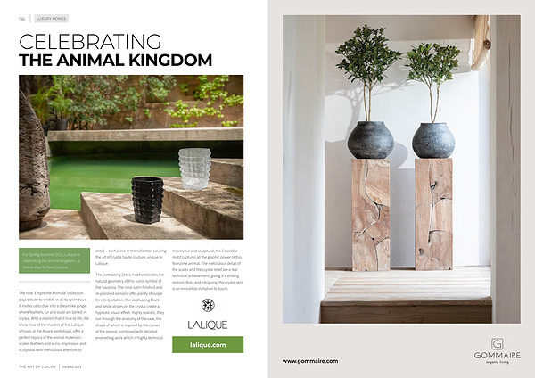 The new ‘ Empreinte Animale ’ collection pays tribute to wildlife in all its splendour . It invites us to dive into a dreamlike jungle where feathers , fur and scale are tamed in crystal . With a realism that is true to life , the know-how of the masters of fire , Lalique artisans at the Alsace workshops , offer a perfect replica of the animal materials – scales , feathers and skins . Impressive and sculptural with meticulous attention to detail – each piece in the collection saluting the art of crystal haute couture , unique to Lalique .
