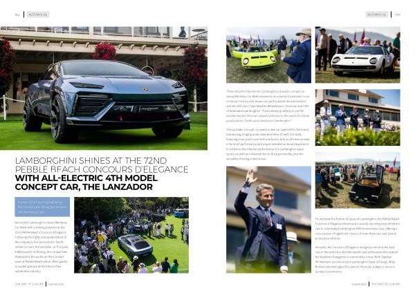 Automobili Lamborghini closed Monterey Car Week with a striking presence at the 72nd Pebble Beach Concours d ’ Elegance . Following the highly anticipated debut of the company ’ s first pure-electric fourthmodel concept , the Lanzador , at The Quail , A Motorsports Gathering , the car was then displayed to the public on the Concept Lawn at Pebble Beach which offers guests a curated glimpse at the future of the automotive industry .