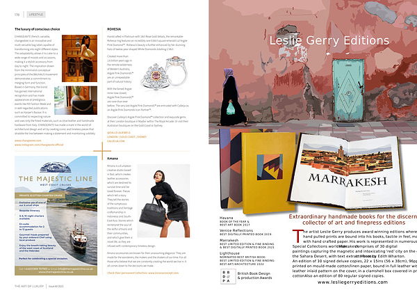 The artist Leslie Gerry produces award winning editions where his hand pulled prints are bound into his books , tactile in feel , made with hand crafted paper . His work is represented in numerous Special Collections worldwide . Marrakesh comprises of 30 digital paintings capturing the magnetic and intoxicating ‘ red ’ city on the edge of the Sahara Desert , with text extracts from In Morocco by Edith Wharton . An edition of 10 signed deluxe copies , 22 x 15ins ( 56 x 38cm ), 96pp , printed on mould-made cotton / linen paper , bound in full leather with a leather inlaid pattern on the cover , in a clamshell box covered in printed cotton . Also an edition of 80 regular signed copies . www . lesliegerryeditions . com