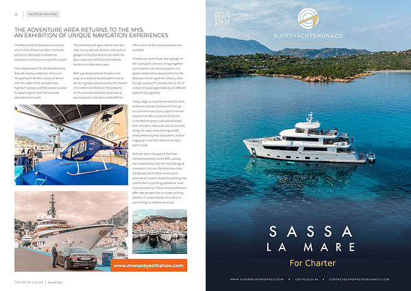 With the return this year of the three themed exhibitions to the MYS , namely the Sustainability Hub , the Yacht Design & Innovation Hub and the Adventure Area , the Monaco Yacht Show continues to promote all aspects related to yachting that contribute to a yachting experience . even more exceptional . These various exhibitions offer new perspectives on super yachting , whether it ’ s sustainability , innovation in yacht design or adventures at sea .