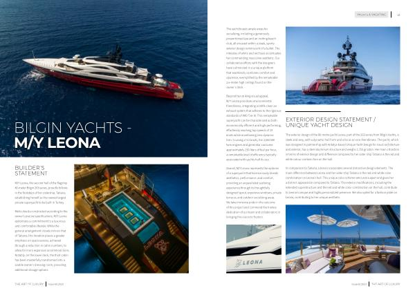 The exterior design of the 80-metre yacht Leona , part of the 263 series from Bilgin Yachts , is sleek and sexy , with a dynamic hull form and a focus on eco-friendliness . The yacht , which was designed in partnership with Antalya-based Unique Yacht Design for naval architecture and exterior , has a steel-aluminum structure and weighs 1,755 groston . Her main attraction in terms of exterior design and difference compared to her sister ship Tatiana is the red and white colour combination on the hull .