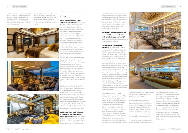 Could you highlight some of the differences with Tatiana ? In comparison to Tatiana , Leona incorporates several distinctive design elements . The main difference between Leona and her sister ship Tatiana is the red and white color combination on Leona ’ s hull . This unique color scheme sets Leona apart and gives her a distinct appearance compared to Tatiana . The exterior modifications , including the extended superstructure and the red and white color combination on the hull , contribute to Leona ’ s unique and highly personalized presence . We also opted for a fashion plate on Leona , contributing to her unique aesthetic .