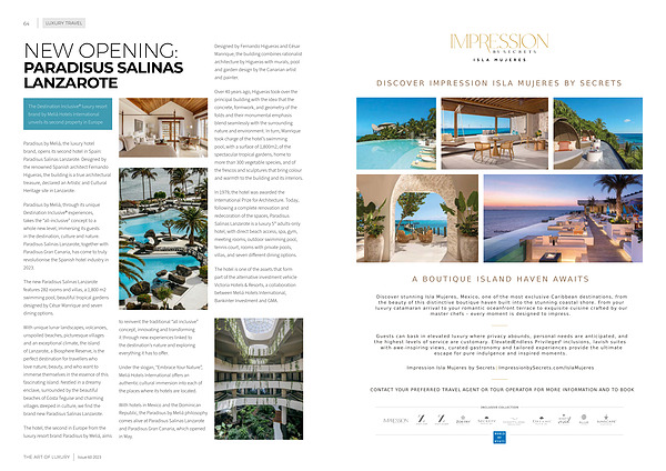 Paradisus by Meliá , through its unique Destination Inclusive ® experiences , takes the “ all-inclusive ” concept to a whole new level , immersing its guests in the destination , culture and nature . Paradisus Salinas Lanzarote , together with Paradisus Gran Canaria , has come to truly revolutionise the Spanish hotel industry in 2023 .
