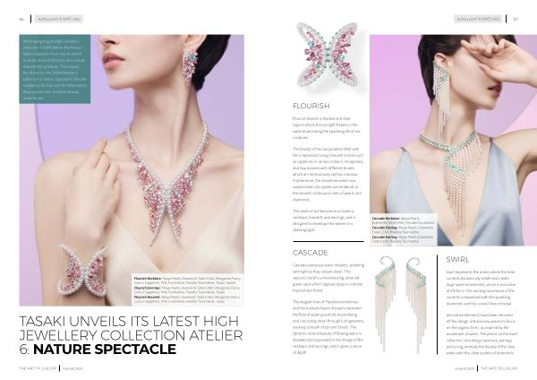 Cascade expresses water droplets , sparkling with light as they stream down . This season ’ s motif is a mesmerizing , emeraldgreen oasis which appears deep in a dense tropical rain forest .