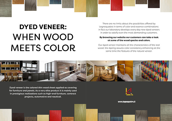 Dyed veneer is the colored thin wood sheet applied as covering for furniture and panels . As a very elite product it is mainly used in prestigious realizations such as high-end furniture , contract projects , automotive and nautical .