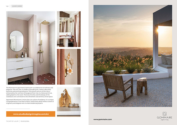 The Montmartre apartment ’ s bathroom is a celebration of softness and elegance . The wall tiles , in shades of powder pink , create a delicately feminine and soothing ambiance . The smooth texture of the tiles is enhanced by the contrast of hexagonal floor tiles in a Siena earth hue , adding depth to the room . The brass finishes and the design of the washbasin unit contribute to the refinement and serenity of the space .