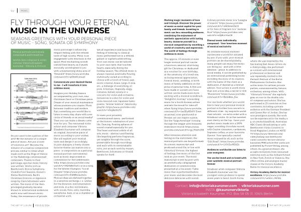 Imagine your Holiday Season accompanied by your own , new Christmas Carol or Christmas piece . Dream of your musical masterpiece whose premiere you inspire : Music between tradition and modern flair , something you would like to listen to every day , share with your circle of friends or on social media ? Then you can make a dream come true for you . The renowned violin soloist and composer Viktoria Elisabeth Kaunzner will compose an original , innovative piece of music according to your wishes : She will explore your musical taste and design it accordingly . In joint dialogue , a freely chosen favorite theme can mature into a piece - a composition as a personal musical portrait : instrumental such as music improvised on commission for the Liebermann Villa : https :// www . youtube . com / watch ? v = fAZZd5CfwCc or as a song for the Winter Olympics : “ Lucid Dreams ” https :// www . youtube . com / watch ? v = E4NBn2azm2o Musical ideas are defined together in a sensitive exchange , i . e . wishes for the duration , instrumentation and style , in a duo violin / piano , with vocals , flute , cello , marimba , saxophone , harp , or as a chamber or orchestral work .