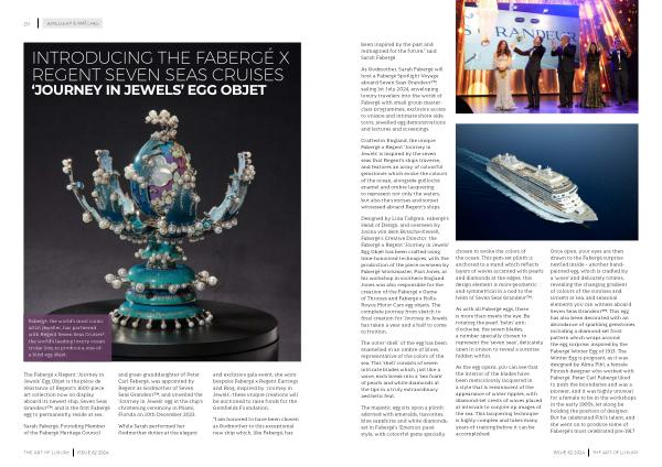 Once open , your eyes are then drawn to the Fabergé surprise nestled inside – another handpainted egg , which is cradled by a ‘ wave ’ and delicately rotates , revealing the changing gradient of colours of the sunrises and sunsets at sea , and seasonal elements you can witness aboard Seven Seas Grandeur™ . This egg has also been decorated with an abundance of sparkling gemstones , including a diamond-set frost pattern which wraps around the egg surprise , inspired by the Fabergé Winter Egg of 1913 . The Winter Egg is poignant , as it was designed by Alma Pihl , a female Finnish designer who worked with Fabergé . Peter Carl Fabergé liked to push the boundaries and was a pioneer , and it was highly unusual for a female to be in the workshops in the early 1900s , let along be holding the position of designer . But he celebrated Pihl ’ s talent , and she went on to produce some of Fabergé ’ s most celebrated pre-1917