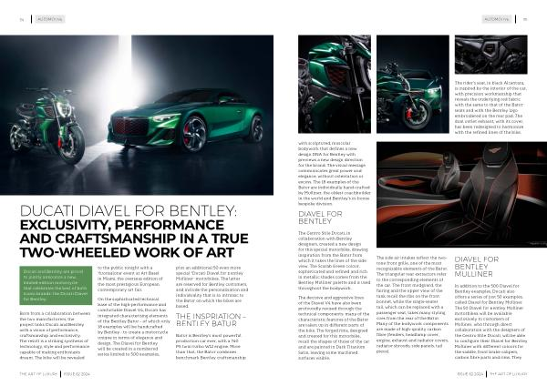 In addition to the 500 Diavel for Bentley examples , Ducati also offers a series of just 50 examples , called Diavel for Bentley Mulliner . The 50 Diavel for Bentley Mulliner motorbikea will be available exclusively to customers of Mulliner , who through direct collaboration with the designers of the Centro Stile Ducati , will be able to configure their Diavel for Bentley Mulliner with different colours for the saddle , front brake calipers , carbon fibre parts and rims . They