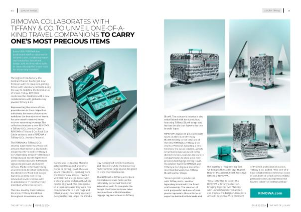 “ We are proud to join forces with Tiffany & Co ., another legendary brand with the finest craftsmanship . The creation of such purposeful and one-of-kind pieces represents the centuries of expertise behind both brands and the mastery of engineering that we bring to the table ,” says Hugues Bonnet-Masimbert , Chief Executive Officer at RIMOWA .