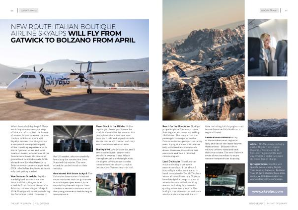 When does a holiday begin ? Many would say the moment you step off the aircraft and feel the breeze of a new climate , however the new London to Bolzano route with SkyAlps ensures that the journey is very much an important part of the travelling experience , with South Tyrolean wines and local treats on board , a closer look at the Dolomites at lower altitudes and guaranteed no middle seats ! With a brand-new London Gatwick to Bolzano route commencing in April 2024 – the Italian boutique airline is only just getting started .