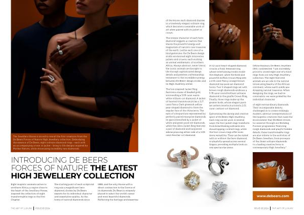 The unique character of each hero diamond suggests a creature that shares the powerful energy and magnetism of nature ’ s rare treasures of the earth . Led by each one-of-akind gemstone , the De Beers design studio envisioned eight innovative jackets and crowns , each evoking an animal emblematic of southern Africa . Always abstract , never literal , the iconic animals are brought to life through sophisticated design details and peerless craftsmanship : testament to the incredible synergy between De Beers ’ design studio and its High Jewellery atelier .