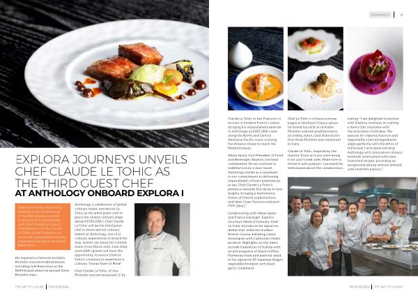 Alban Gjoka , Vice President of Food and Beverages , Explora Journeys commented , “ As we continue to redefine luxury ocean travel , Anthology stands as a testament to our commitment to delivering unparalleled culinary experiences at sea . Chef Claude Le Tohic ’ s presence elevates this series to new heights , bringing a harmonious fusion of French sophistication and West Coast flavours onboard EXPLORA I .”