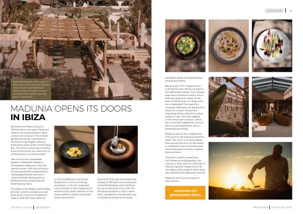 Derived from ‘ Mama Dunia ’ or ‘ Mother Earth ’, the name ‘ Madunia ’ reflects the establishment ’ s deep connection to nature . The outside garden restaurant is perched on the hills of Cap Negret , offering panoramic views of the surrounding bay . The indoor venue has a rooftop terrace that serves as a sanctuary to witness Ibiza ’ s stunning sunsets .