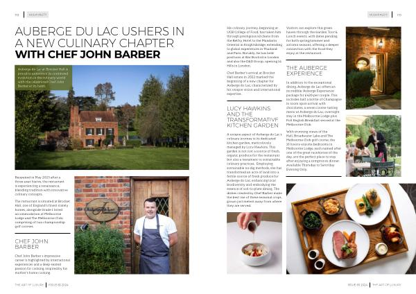 A unique aspect of Auberge du Lac ’ s culinary journey is its dedicated kitchen garden , meticulously managed by Lucy Hawkins . This garden is not just a source of fresh , organic produce for the restaurant but also a testament to sustainable culinary practices . Employing sustainable no-dig methods , she has transformed an acre of land into a fertile source of fresh produce for Auberge du Lac , enhancing local biodiversity and embodying the essence of soil-to-plate dining . The dishes created by Chef Barber make the best use of these seasonal crops , grown just meters away from where they are served .
