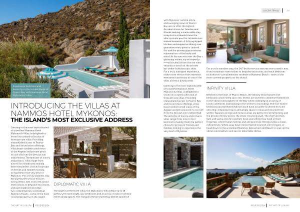 Catering to the most sophisticated of travellers Nammos Hotel Mykonos & Villas , is delighted to unveil its curated collection of three private villas . Providing unparalleled access to Psarou Bay and its exclusive offerings , villas boast unobstructed views of the Aegean and private pools to cool off from the Grecian sun undisturbed . The epitome of luxury and privacy , villas range from nine to four bedrooms making them the perfect choice for groups of friends and families looking to experience the very best of Mykonos .