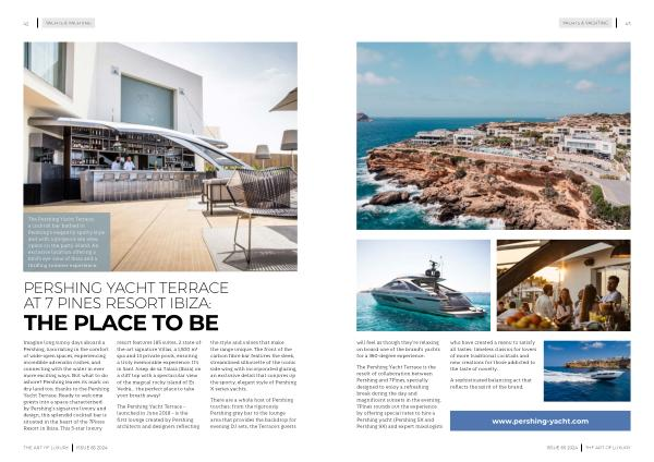The Pershing Yacht Terrace is the result of collaboration between Pershing and 7Pines , specially designed to enjoy a refreshing break during the day and magnificent sunsets in the evening . 7Pines rounds out the experience by offering special rates to hire a Pershing yacht ( Pershing 5X and Pershing 9X ) and expert mixologists who have created a menu to satisfy all tastes : timeless classics for lovers of more traditional cocktails and new creations for those addicted to the taste of novelty .