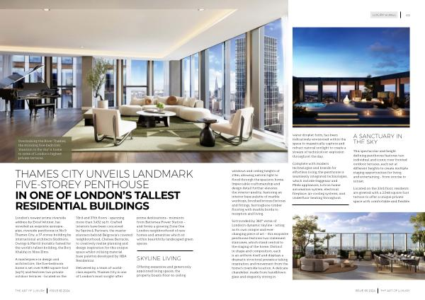 Surrounded by 360 ° vistas of London ’ s dynamic skyline - acting as its own unique and everchanging piece of art – this exquisite penthouse features two statement staircases , which stand central to the staging of the home . Distinct in shape and composition , each is an artform itself and displays a dramatic structural presence taking inspiration and movement from the home ’ s riverside location . A delicate chandelier , made from handblown glass and elegantly strung in water droplet form , has been indicatively envisioned within the space to majestically capture and refract natural sunlight to create a stream of technicolour explosion throughout the day .