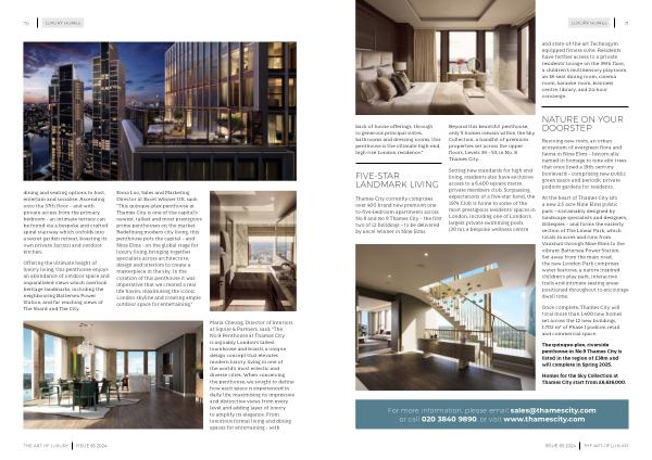 Maria Cheung , Director of Interiors at Squire & Partners , said : “ The No . 9 Penthouse at Thames City is arguably London ’ s tallest townhouse and boasts a unique design concept that elevates modern luxury living in one of the world ’ s most eclectic and diverse cities . When conceiving the penthouse , we sought to define how each space is experienced in daily life , maximising its impressive and distinctive views from every level and adding layer of luxury to amplify its elegance . From luxurious formal living and dining spaces for entertaining - with