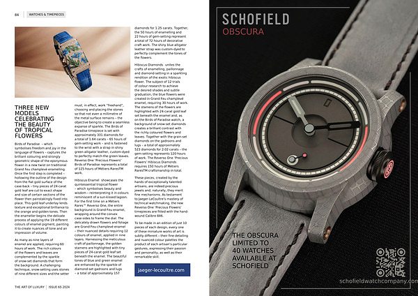 As many as nine layers of enamel are applied , requiring 60 hours of work . The rich colours of the flowers and leaves are complemented by the sparkle of snow-set diamonds that form the background . A challenging technique , snow-setting uses stones of nine different sizes and the setter must , in effect , work “ freehand ”, choosing and placing the stones so that not even a millimetre of the metal surface remains – the objective being to create a seamless expanse of sparkle . The Birds of Paradise timepiece is set with approximately 331 diamonds for a total of 1.64 carats – 65 hours of gem-setting work – and is fastened to the wrist with a strap in shiny green alligator leather , custom-dyed to perfectly match the green leaves . Reverso One ‘ Precious Flowers ’ Birds of Paradise represents a total of 125 hours of Métiers RaresTM work .