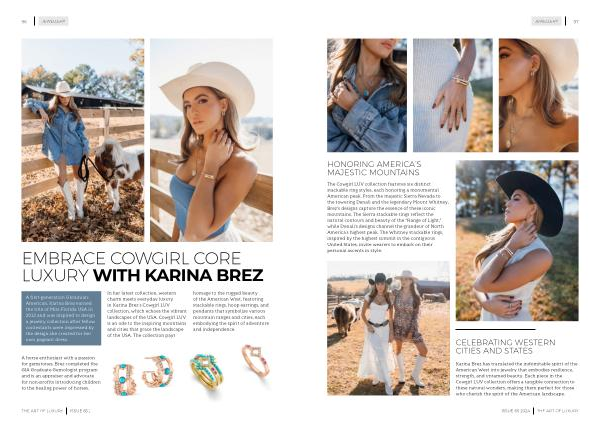 In her latest collection , western charm meets everyday luxury in Karina Brez ’ s Cowgirl LUV collection , which echoes the vibrant landscapes of the USA . Cowgirl LUV is an ode to the inspiring mountains and cities that grace the landscape of the USA . The collection pays homage to the rugged beauty of the American West , featuring stackable rings , hoop earrings , and pendants that symbolize various mountain ranges and cities , each embodying the spirit of adventure and independence .