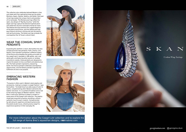 “ Turquoise is often used in Western-style jewelry and accessories , making it a staple in cowgirl fashion ,” says Karina Brez . “ Its bright blue hue adds a pop of color to outfits , complementing other Western elements like leather and silver . It is a symbol of tradition and a nod to the enduring legacy of Western fashion .” Karina Brez ’ s meticulous attention to detail is evident in every piece of the Cowgirl LUV collection . The jewelry showcases exquisite turquoise , providing a vibrant , authentic touch to each creation . Complemented by delicate pink sapphires and dazzling diamonds , the jewels exude luxury , allowing every cowgirl to experience opulence in their everyday life .