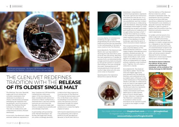 In tandem with the launch of its oldest single malt , and to further honour its 200th anniversary , The Glenlivet has partnered with Sotheby ’ s to create a unique auction lot . A bespoke 55 Year Old single malt whisky presented with a oneof-a-kind Hansmeyer sculpture will be available exclusively at auction from 22nd October – 5th November 2024 , with all proceeds to benefit National Trust for Scotland , dedicated to conserving Scotland ’ s natural and cultural heritage .