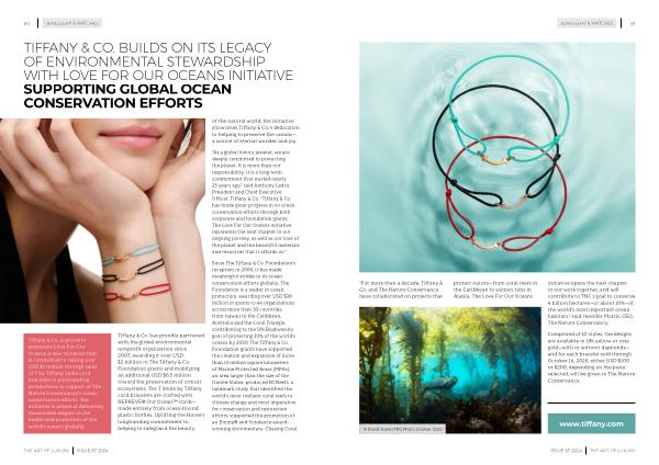 TIFFANY & CO . BUILDS ON ITS LEGACY OF ENVIRONMENTAL STEWARDSHIP WITH LOVE FOR OUR OCEANS INITIATIVE SUPPORTING GLOBAL OCEAN CONSERVATION EFFORTS of the natural world , the initiative showcases Tiffany & Co .’ s dedication to helping to preserve the oceans — a source of eternal wonder and joy .