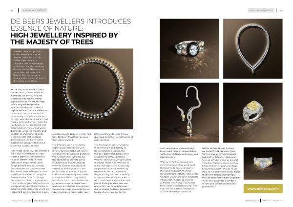 “ Nature is the force that drives our creativity , and we work hard to preserve its precious beauty through our Building Forever sustainability programs ,” says Céline Assimon , CEO of De Beers Jewellers . “ In the first Chapter of Essence of Nature we celebrate our roots , both literally and figuratively . Tree roots are the unseen foundations of incredible beauty that can last for millennia , and humans are instinctively drawn to trees for their awe-inspiring longevity and stature . Likewise , diamonds have an intrinsic allure as ancient miracles of Nature whose journey began millions of years ago deep beneath the Earth . Thanks to the skills of our diamond cutters , design studio and master craftspeople , they are transformed into exquisite jewels that celebrate a moment in time and will be treasured for generations .” www . debeers . com