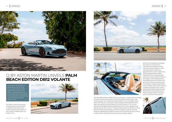 The Palm Beach Edition DB12 Volante is a tribute to oceanic blue, featuring an exclusive Q by Aston Martin Frosted Glass Blue exterior paint. The exclusive paint color exhibits qualities unique to the use of glass flakes within the topcoat, creating the unmistakeably mesmerising shimmer effect that perfectly encapsulates the south Florida sun. This is only achievable through hand spray application due to the complexity and delicate nature of this colour. The open-top Super GT also features a Club Sport White pinstripe applied to the front splitters, side sills and rear bumpers, highlighting the DB12 Volante’ s firmly planted sportscar stance, as well as Gloss Jet Black diamond-turned five-spoke wheels.
