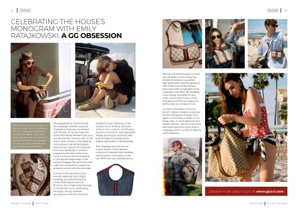 Photographed by Daniel Arnold, the campaign unfolds a balance of presence and ease, movement and stillness. As the protagonists move effortlessly between the city’ s crowds and the carefree calm of the beach, their journey is threaded by one constant, the GG Monogram. Worn across a spectrum of pieces, from new handbags to archivalinspired travel silhouettes from the Gucci Savoy line tracing back to the House’ s beginnings in the world of luggage, the motif becomes a discreet companion, a signature presence woven into the everyday.