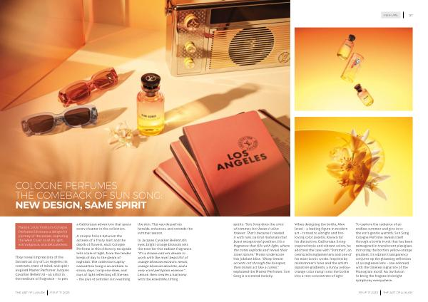 PERFUME 97 spirits.“ Sun Song dons the color of summer, but keeps it alive forever. That’ s because I created it with rare, natural materials that boast exceptional qualities. It’ s a fragrance that fills with light, where the notes explode and reveal their inner nature.” Musks underscore this jubilant bliss.“ Sharp lemon accents cut through the bouquet, then musks act like a caress,” explained the Master Perfumer. Sun Song is a scented melody.