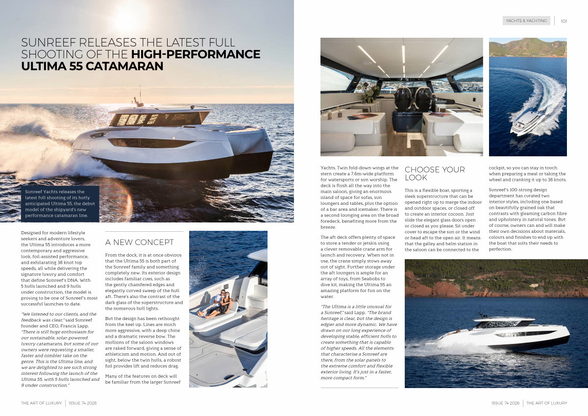 “ The Ultima is a little unusual for a Sunreef,” said Lapp.“ The brand heritage is clear, but the design is edgier and more dynamic. We have drawn on our long experience of developing stable, efficient hulls to create something that is capable of higher speeds. All the elements that characterise a Sunreef are there, from the solar panels to the extreme comfort and flexible exterior living. It’ s just in a faster, more compact form.”