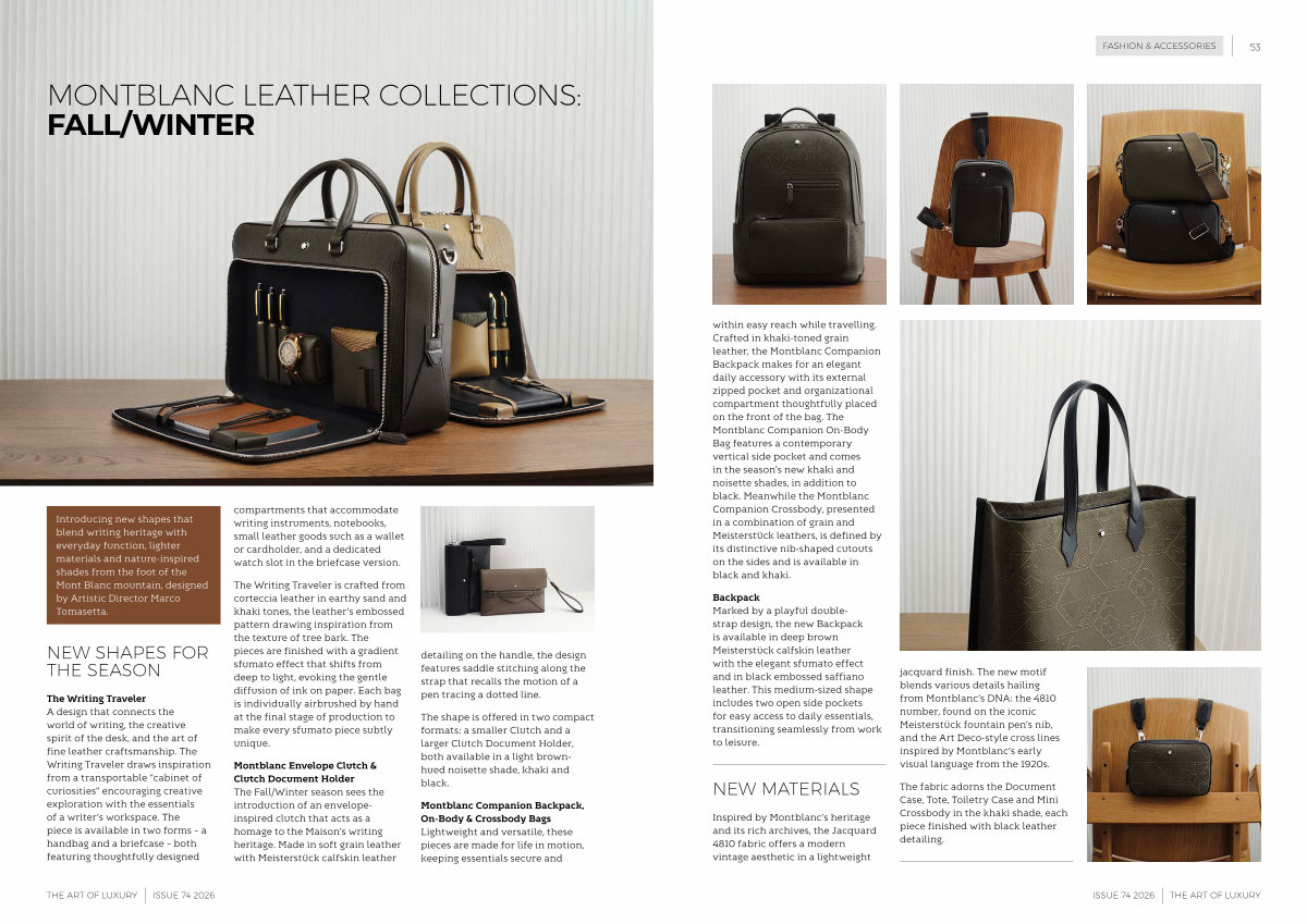 FASHION & ACCESSORIES 53 within easy reach while travelling. Crafted in khaki-toned grain leather, the Montblanc Companion Backpack makes for an elegant daily accessory with its external zipped pocket and organizational compartment thoughtfully placed on the front of the bag. The Montblanc Companion On-Body Bag features a contemporary vertical side pocket and comes in the season’ s new khaki and noisette shades, in addition to black. Meanwhile the Montblanc Companion Crossbody, presented in a combination of grain and Meisterstück leathers, is defined by its distinctive nib-shaped cutouts on the sides and is available in black and khaki.