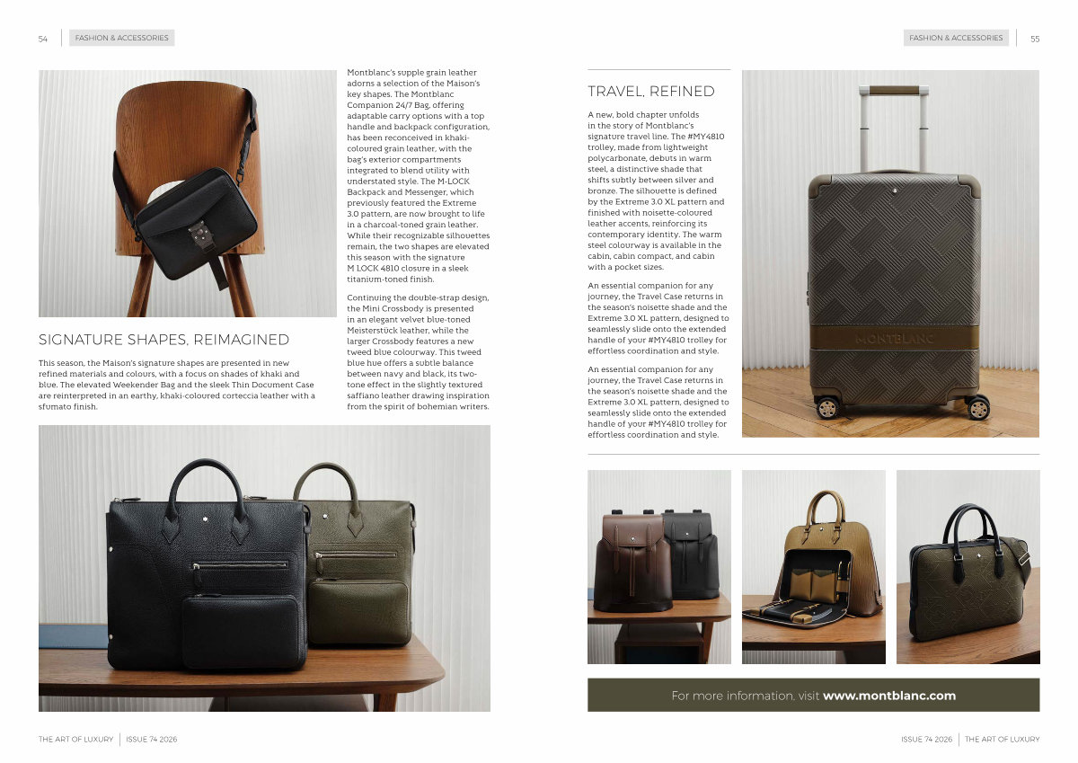 Montblanc’ s supple grain leather adorns a selection of the Maison’ s key shapes. The Montblanc Companion 24 / 7 Bag, offering adaptable carry options with a top handle and backpack configuration, has been reconceived in khakicoloured grain leather, with the bag’ s exterior compartments integrated to blend utility with understated style. The M-LOCK Backpack and Messenger, which previously featured the Extreme 3.0 pattern, are now brought to life in a charcoal-toned grain leather. While their recognizable silhouettes remain, the two shapes are elevated this season with the signature M LOCK 4810 closure in a sleek titanium-toned finish.