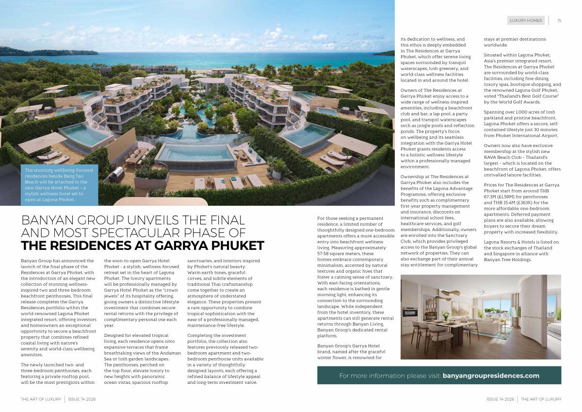 Ownership at The Residences at Garrya Phuket also includes the benefits of the Laguna Advantage Programme, offering exclusive benefits such as complimentary first-year property management and insurance, discounts on international school fees, healthcare services, and golf memberships. Additionally, owners are enrolled into the Sanctuary Club, which provides privileged access to the Banyan Group’ s global network of properties. They can also exchange part of their annual stay entitlement for complimentary