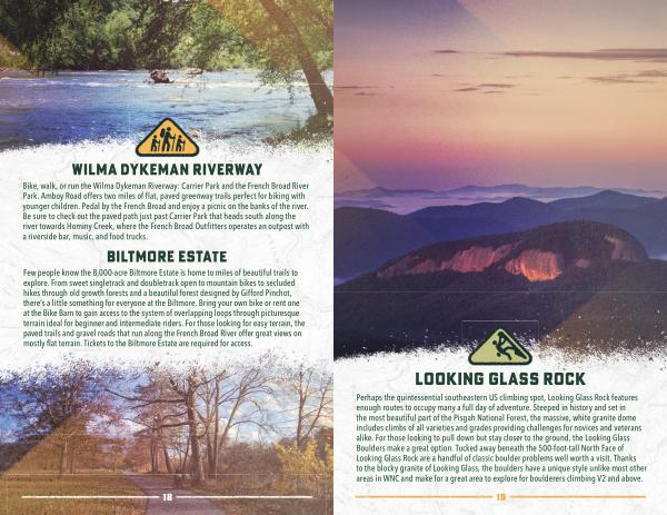 Bike , walk , or run the Wilma Dykeman Riverway : Carrier Park and the French Broad River Park . Amboy Road offers two miles of flat , paved greenway trails perfect for biking with younger children . Pedal by the French Broad and enjoy a picnic on the banks of the river . Be sure to check out the paved path just past Carrier Park that heads south along the river towards Hominy Creek , where the French Broad Outfitters operates an outpost with a riverside bar , music , and food trucks .