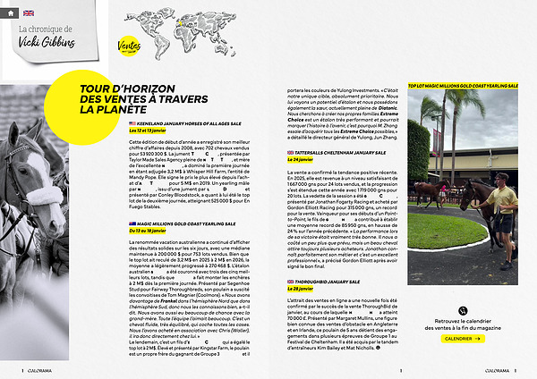 La renommée vacation australienne a continué d’ afficher des résultats solides sur les six jours, avec une médiane maintenue à 200 000 $ pour 753 lots vendus. Bien que le top lot ait reculé de 3,2 M$ en 2025 à 2 M$ en 2026, la moyenne a légèrement progressé à 270 468 $. L’ étalon australien Snitzel a été couronné avec trois des cinq meilleurs lots, tandis que Frankel a fait monter les enchères à 2 M$ dès la première journée. Présenté par Segenhoe Stud pour Fairway Thoroughbreds, son poulain a suscité les convoitises de Tom Magnier (Coolmore). « Nous avons davantage de Frankel dans l’ hémisphère Nord que dans l’ hémisphère Sud, donc nous les connaissons bien, a-t-il dit. Nous avons aussi eu beaucoup de chance avec la grand-mère. Toute l’ équipe l’ aimait beaucoup. C’ est un cheval fluide, très équilibré, qui coche toutes les cases. Nous l’ avons acheté en association avec Chris (Waller), il ira donc directement chez lui. » Le lendemain, c’ est un fils d’ Extreme Choice qui a égalé le top lot à 2 M$. Élevé et présenté par Kingstar Farm, le poulain est un propre frère du gagnant de Groupe 3 Wollombi et il portera les couleurs de Yulong Investments. « C’ était notre unique cible, absolument prioritaire. Nous lui voyons un potentiel d’ étalon et nous possédons également la sœur, actuellement pleine de Diatonic. Nous cherchons à créer nos propres familles. Extreme Choice est un étalon très performant et pourrait marquer l’ histoire à l’ avenir, c’ est pourquoi M. Zhang essaie d’ acquérir tous les Extreme Choice possibles, » a détaillé le directeur général de Yulong, Jun Zhang.