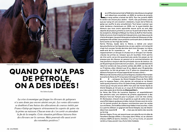 Les chiffres( provenant de la Fédération des éleveurs du galop) sont désormais consolidés: en 2025, le nombre de juments pur-sang saillies a baissé de 4,4 %. Pour les juments AQPS le verdict est encore plus sévère:- 13,5 %. Ces poulinières autres que pur-sang ont une vocation « obstacle », le pan de la filière du galop qui souffre le plus actuellement. Tout laisse à penser que cette tendance s’ accentuera en 2026, car la quasi-totalité des éleveurs que nous avons approchés assure qu’ ils se sont déjà séparés de plusieurs juments ou sont sur le point de le faire. Parmi les exceptions, Edwige le Métayer du Haras du Buff en Normandie. Cette structure vit principalement des pensions, avec beaucoup de clients étrangers. Les poulinières personnelles de l’ éleveuse ont des pedigrees très solides. Leurs produits continuent donc à réaliser de bons scores sur les rings des ventes. Karine Perreau, basée dans la Nièvre, a réalisé une saison époustouflante sur les hippodromes, où ses « petits » ont remporté vingt-huit courses l’ année dernière dont trois Groupes. Le même week-end de fin novembre Ocre et Koktail Brut lui ont offert respectivement un Groupe 3 à Auteuil et un Groupe 2 en Irlande. « Seules les primes au naisseur que j’ ai touchées m’ ont permis de m’ en sortir, car je n’ ai quasiment pas vendu l’ an passé. Je n’ ai presque pas de chevaux en pension et la commercialisation de mes poulains a toujours été ma principale source de revenus. Là, j’ ai 10 yearlings et autant de 2 ans en stock … J’ ai considérablement réduit le nombre de mes juments saillies dès 2025: au lieu de 16 ou 17 pleines, elles n’ étaient que 12 au départ, pour 10 gestantes aujourd’ hui. Le fait de grimper à la 11 e place au classement des éleveurs français ne m’ a pas apporté de nouveau client. » Même son de cloches chez Laurence Gagneux, basée en Normandie tout près du Haras du Pin et qui peut s’ enorgueillir d’ avoir fait naître Diamond Carl, vainqueur du Grand Steeple-Chase de Paris 2025 pour la casaque Papot. « L’ an dernier, j’ ai anticipé en ne faisant saillir que 6 juments sur 12 ou 13. Cette année, j’ ai tellement un petit moral que je n’ ai pas encore défini mon plan de monte! Après le Grand Steeple, je n’ ai pas eu un coup de fil d’ acheteur potentiel pour des sujets de la famille de Diamond Carl. » Le Haras des Éclos de Laurence Gagneux vit essentiellement des pensions avec une trentaine de juments appartenant à des éleveurs hors-sol, français pour la plupart. « L’ un de mes clients, M. Montauban, m’ avait mise en garde au sujet de cette crise qui se profilait depuis quelques années, mais je n’ ai pas voulu le croire. Je n’ ai jamais produit de chevaux commerciaux pour les ventes aux enchères. J’ ai le défaut d’ être trop fidèle à mes souches. » Cela lui a permis d’ élever un gagnant de Grand Steeple, issu de l’ étalon désormais exporté Diamond Boy, mais pas de battre des records sur le ring. Damien Vagne, 31 ans, est associé avec son père Bruno à la tête de l’ excellent élevage d’ Allen, à Souvigny dans l’ Allier, où se côtoient chevaux AQPS et bovins charolais. « Il y a 4 ou 5 ans, on pouvait vendre un beau poulain issu d’ une mère modeste.