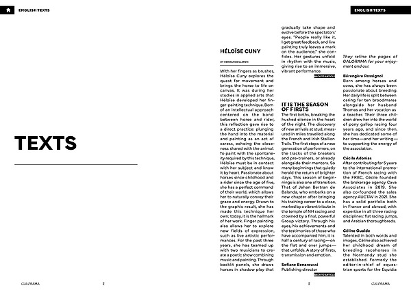 The first births, breaking the hushed silence in the heart of the night. The discovery of new arrivals at stud, measured in miles travelled along the French and Irish Stallion Trails. The first steps of a new generation of performers, on the tracks of the breakers and pre-trainers, or already alongside their mentors. So many beginnings that quietly herald the return of brighter days. This season of beginnings is also one of transition. That of Jehan Bertran de Balanda, who embarks on a new chapter after bringing his training career to a close, marked by a vibrant tribute in the temple of NH racing and crowned by a final, powerful Group victory. Through his eyes, his achievements and the testimonies of those who have accompanied him, it is half a century of racing— on the flat and over jumps— that unfolds. A story of firsts, transmission and emotion.
