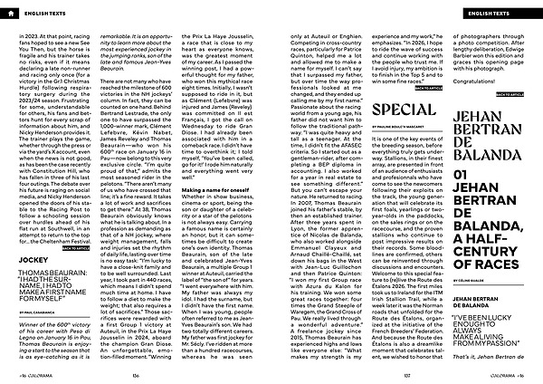 ENGLISH TEXTS only at Auteuil or Enghien. Competing in cross-country races, particularly for Patrice Quinton, helped me a lot and allowed me to make a name for myself. I can’ t say that I surpassed my father, but over time the way professionals looked at me changed, and they ended up calling me by my first name.” Passionate about the racing world from a young age, his father did not want him to follow the traditional pathway.“ I was quite heavy and tall as a teenager. At the time, I didn’ t fit the AFASEC criteria. So I started out as a gentleman-rider, after completing a BEP diploma in accounting. I also worked for a year in real estate to see something different.” But you can’ t escape your nature. He returned to racing. In 2007, Thomas Beaurain joined his father’ s stable, by then an established trainer. After three years spent in Lyon, the former apprentice of Nicolas de Balanda, who also worked alongside Emmanuel Clayeux and Arnaud Chaillé-Chaillé, set down his bags in the West with Jean-Luc Guillochon and then Patrice Quinton:“ I won my first Group race with Azura du Kalon for his training. We won some great races together: four times the Grand Steeple of Waregem, the Grand Cross of Pau. We really lived through a wonderful adventure.” A freelance jockey since 2015, Thomas Beaurain has experienced highs and lows like everyone else:“ What makes my strength is my experience and my work,” he emphasizes.“ In 2026, I hope to ride the wave of success and continue working with the people who trust me. If I avoid injury, my ambition is to finish in the Top 5 and to win some fine races.”