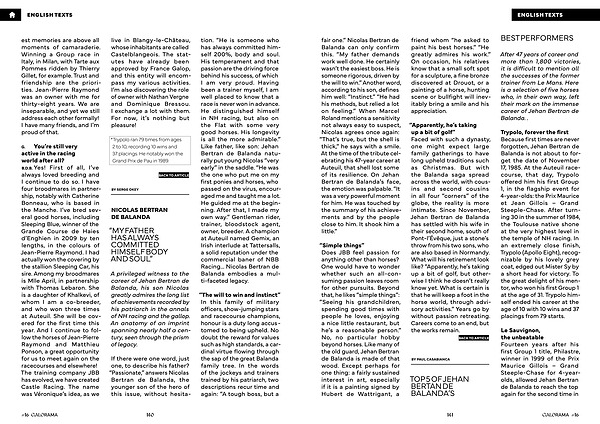 ENGLISH TEXTS fair one.” Nicolas Bertran de Balanda can only confirm this.“ My father demands work well done. He certainly wasn’ t the easiest boss. He is someone rigorous, driven by the will to win.” Another word, according to his son, defines him well:“ Instinct.”“ He had his methods, but relied a lot on feeling.” When Marcel Roland mentions a sensitivity not always easy to suspect, Nicolas agrees once again:“ That’ s true, but the shell is thick,” he says with a smile. At the time of the tribute celebrating his 47-year career at Auteuil, that shell lost some of its resilience. On Jehan Bertran de Balanda’ s face, the emotion was palpable.“ It was a very powerful moment for him. He was touched by the summary of his achievements and by the people close to him. It shook him a little.”