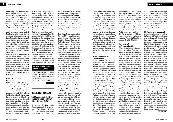 ENGLISH TEXTS could not understand why horses from Enghien were running at Auteuil and vice versa.” Running jump races at both Enghien, before its closure in 2016, and Auteuil has long divided opinion and sparked debate. One of the pioneers of this approach was Guillaume Macaire:“ He was one of the first to present hurdle and steeplechase horses at both racecourses,” recalls Dominique Boulard.“ His training methods and professionalism made it possible. Jehan, a fine horseman, has also always had very well-schooled horses over obstacles. His runners rarely fell.”