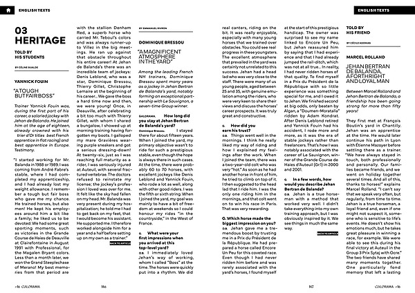 ENGLISH TEXTS real canters, riding on the bit. It was really enjoyable, especially with many young horses that we trained over obstacles. You could see real progress in these youngsters. The excellent atmosphere that prevailed in the yard was certainly not unrelated to this success. Jehan had a head lad who was very close to the staff. There were many of us young people, aged between 25 and 35, with genuine emulation among the riders, who were very keen to share their views and discuss the horses’ career prospects. It was truly great and constructive.