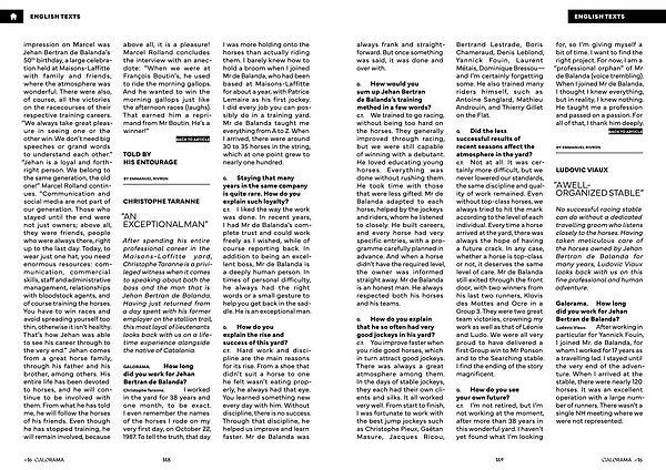 C. T. We trained to go racing, without being too hard on the horses. They generally improved through racing, but we were still capable of winning with a debutant. He loved educating young horses. Everything was done without rushing them. He took time with those that were less gifted. Mr de Balanda adapted to each horse, helped by the jockeys and riders, whom he listened to closely. He built careers, and every horse had very specific entries, with a programme carefully planned in advance. And when a horse didn’ t have the required level, the owner was informed straight away. Mr de Balanda is an honest man. He always respected both his horses and his teams.