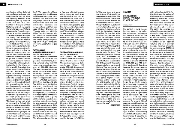TATTERSALLS CHELTENHAM JANUARY SALE – 24 JANUARY The Tattersalls Cheltenham January Sale continued the positive recent trend, having suffered a low in 2024 when only achieving a turnover of 876,000 Guineas. The sale returned to better order in 2025 when accumulating 1,667,000 from twenty-four sold lots and increased again with a turnover of 1,719,000 Guineas in 2026 from twenty sold lots. Top billing went to Golden Current, consigned by Jonathan Fogarty Racing and purchased by Gordon Elliott Racing for 315,000 Guineas, a new record price for the sale. A winner of a point-to-point at Dromahane on debut, the gelding helped contribute to a new record average of £ 85,950, which was a 24 % increase on the previous year. Consigner Fogarty said:“ He did not come to me until July and Dermot Cantillon and David Cox own him with me. The plan was to run him as a five-year-old, but he was doing things so easily that we decided to run him at Dromahane on New Year’ s Eve – he was very impressive, and Golden Horn is a very good sire. It is great to get him here, and the Tattersalls team has looked after us so well.” Gordon Elliott added:“ It was a very good performance when this horse won. He has cost a bit more than we had planned, but a nice horse is always going to have a few lads on him. Jonathan knows the time of day and is a good operator.”