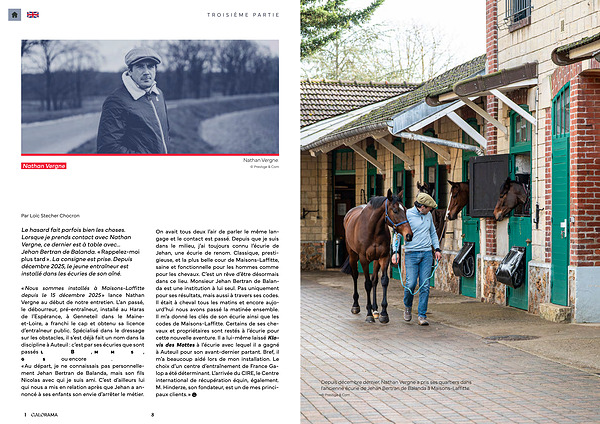« Nous sommes installés à Maisons-Laffitte depuis le 15 décembre 2025 » lance Nathan Vergne au début de notre entretien. L’ an passé, le débourreur, pré-entraîneur, installé au Haras de l’ Espérance, à Genneteil dans le Maineet-Loire, a franchi le cap et obtenu sa licence d’ entraîneur public. Spécialisé dans le dressage sur les obstacles, il s’ est déjà fait un nom dans la discipline à Auteuil: c’ est par ses écuries que sont passés Léopard du Berlais, Matin Midi et Soir, Game of Storm ou encore Kibboutz. « Au départ, je ne connaissais pas personnellement Jehan Bertran de Balanda, mais son fils Nicolas avec qui je suis ami. C’ est d’ ailleurs lui qui nous a mis en relation après que Jehan a annoncé à ses enfants son envie d’ arrêter le métier.