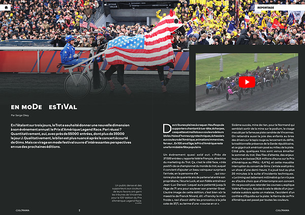 Des tribunes pleines à craquer. Neuf kops de supporters chantant à tue-tête, écharpes, casquettes et maillots aux couleurs de leurs idoles. Haies d’ honneur pyrotechniques, échassiers aux couleurs de l’ Amérique, animations immersives, ferveur … En 105 ans d’ âge, le Prix d’ Amérique reste une formidable fête populaire.