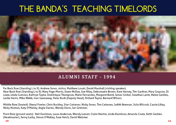 Near Back Row (Standing L to R): Mary Page-Morris, Dawn McRae, Sue Riley, Debonnaire Brown, Kate Harney, Tim Gardner, Mary Grayson, Di Lowe, Linda Gumoes, Kathryn Taylor, Dominique Thompson, Mario Fernandes, Margaret Baird, James Gichui, Jonathan Lamb, Helen Geddes, Leslie Harris, Mike Webb, Ivan Gannaway, Peter Bush (Deputy Head), Richard Taylor, Bernard Wilson.