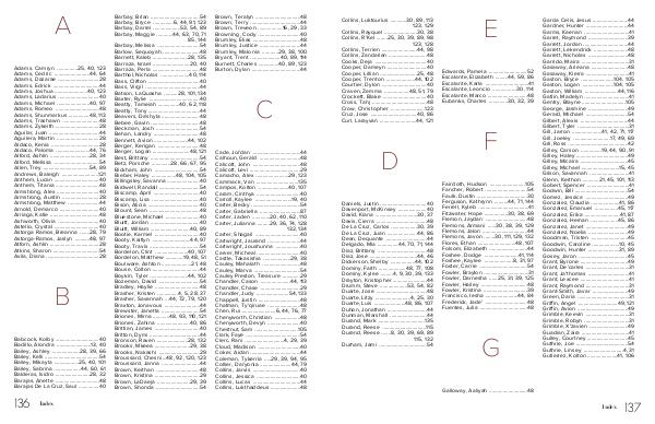 123, 128 Collins, Terrien.......................... 44, 98 Collins, Zandailan............................ 48 Cooks, Deja...................................... 40 Cooper, Dameyn............................. 40 Cooper, Lillian........................... 25, 48 Cooper, Trenton..................... 44, 102 Courtier, Dylon................................. 40 Craven, Zemma.................. 48, 51, 79 Crockett, Blake................................ 40 Cross, Tahj........................................ 48 Crow, Christopher......................... 123 Cruz, Jose.................................. 40, 86 Curl, Larayvan........................... 44, 121